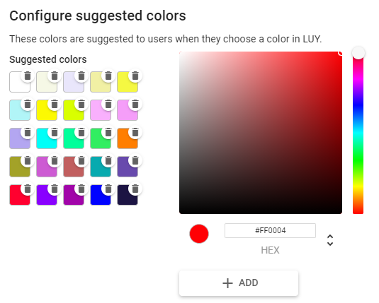 This section allows configuring suggested colors, which will be used in color pickers across the whole application. All colors are sorted by their brightness value.