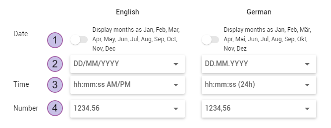 German and English locals can set different formats.