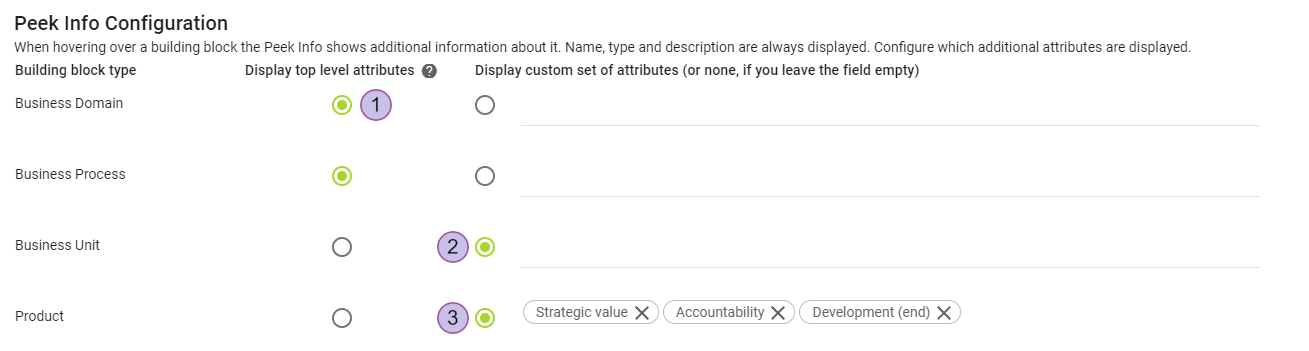 When "display top level attributes" is selected, the attributes from the top-level attribute group are displayed in the peek info box