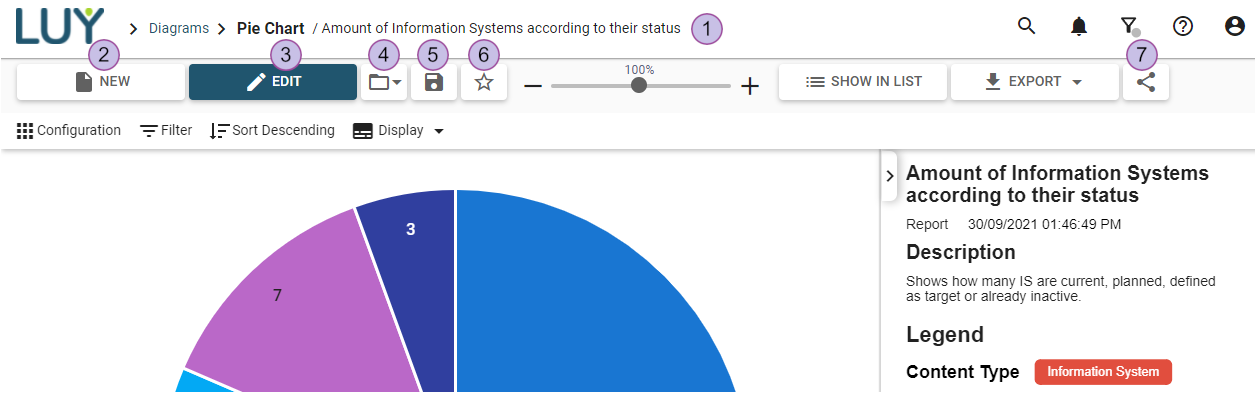 Reports can be created, edited, and saved with the corresponding buttons. Take, e.g., the “pie chart” diagram shown in the screenshot: