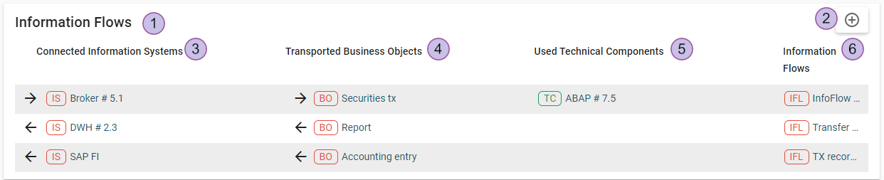 This section is available only for the single element view of information systems. The list shows the direction between information system 1 and information system 2 as well as the list of transported business objects with the respective direction and its used technical components.