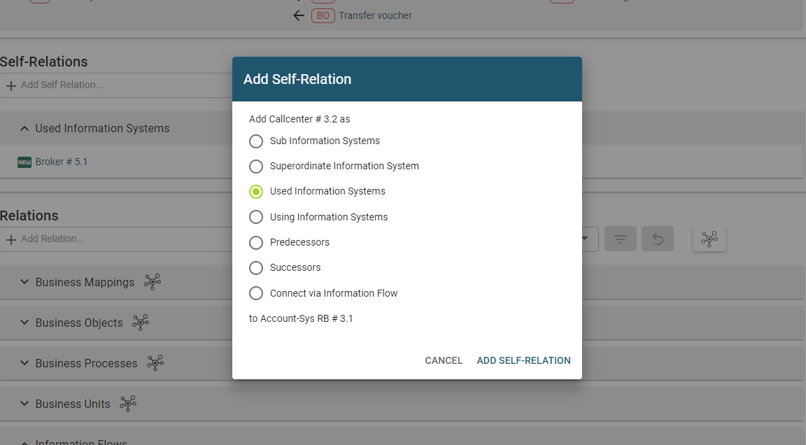 When adding a relation, only the last modification time of the information system is changed, for example, if a connection to a project in the single element view of an information system is added. Only one self-relation can be added at a time.
