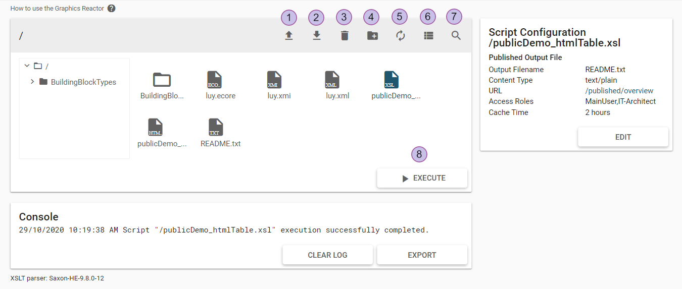 The graphics reactor works by using extensible stylesheet language transformations. Executing an XSLT file performs the transformation and creates one or more output files which can be downloaded. Any other kind of files can also be uploaded, downloaded or deleted within the graphics reactor.
