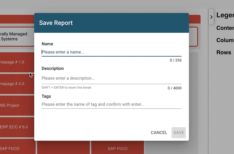Diagrams can be saved and configured to make them available for subsequent use by you and your colleagues. Giving the report a meaningful name goes a long way in keeping a growing list manageable in the long-term. Specifing a description and tags to organize the list of reports is also useful.