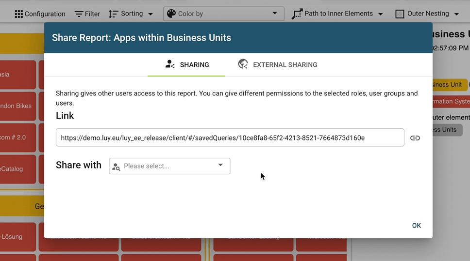 The external sharing functionality allows the user to share an up-to-date version of the diagram for access outside of LUY. This means the external sharing link can be viewed by anyone, and a LUY login is not necessary. Different links can be shared in different languages and file formats. When an external sharing link is accessed, a corresponding up-to-date export is generated. For performance reasons, a caching mechanism might cause a few minutes of delay when making changes to the data.