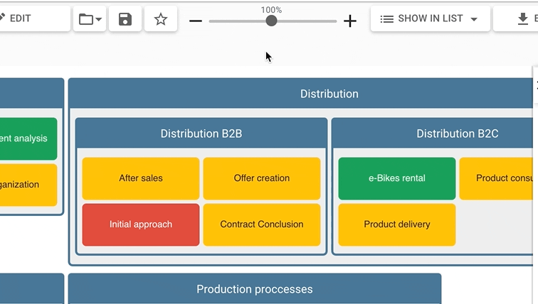 When opening a saved report, the diagram is initially set to view-only. This is helpful for presentation purposes, because it keeps the user interface simple by hiding the toolbar and other configuration instruments. It also prevents unintended modifications that could occur while exploring the diagram. Press “edit” on top of the diagram page to toggle edit-mode and access all configuration options.