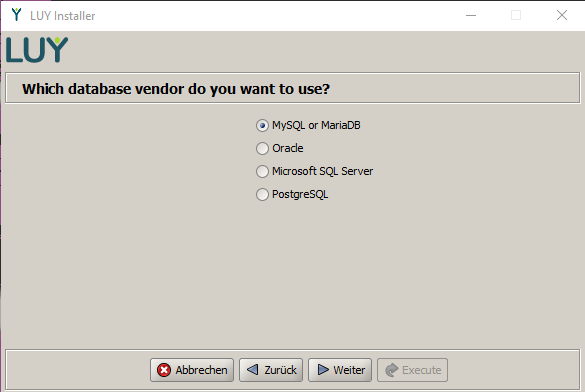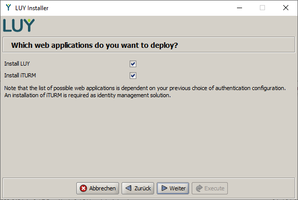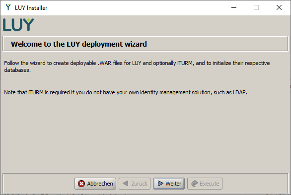 The distribution package comes with the installation utility luyInstaller.jar. You can use it to create application packages (.WAR file) for both LUY and iTURM. Both files are configured according to the values you set in the installer and can be used for operation in a servlet engine. If necessary, the installer also creates the data required for running the application in the relevant databases – such as an initial user account for administration.