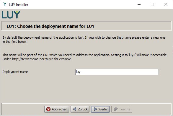 The next step is configuring the name of the application. With the name of the application, you can specify the URI path from which the application can be addressed in the servlet container. With the default settings and default name "LUY", the application will be accessible under http://<servername>:<port>/luy. You will also be prompted to name your iTURM installation, if you are installing iTURM as well.