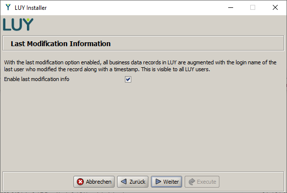 In the following form, you can enable last modification logging. With this option enabled, all building blocks in the database are tagged with the login name of the user who last modified the record and the corresponding modification time. This information will be visible to all LUY users in the GUI.