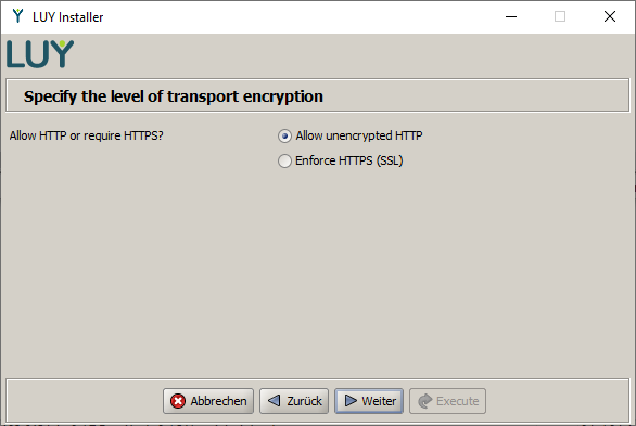 On the next dialog page, you have to select the required access protocol for LUY users. If you choose HTTPS, all connection attempts to LUY will be redirected to a secured HTTPS/SSL connection. This requires that your Tomcat servlet engine accepts HTTPS connections and has an appropriate SSL certificate installed. Please refer to configuration options and notes and to the Tomcat documentation for configuration instructions http://tomcat.apache.org/tomcat-9.0-doc/ssl-howto.html.