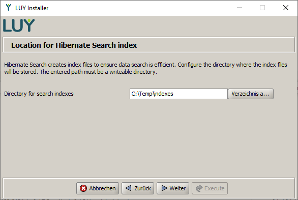 In the next step, you can adjust the path where LUY will store its search index. The Hibernate Search index contains a full-text index of all data entered into LUY. Make sure that the servlet engine has read and write access to the directory you specify here.