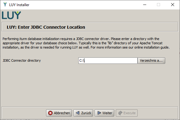 Please verify that a supported version of Apache Tomcat is installed and that the “CATALINA_HOME” environment variable references the Tomcat installation folder. Also make sure that you have write access to the subfolder webapps of the Tomcat installation folder, as the LUY installer will use this folder later on.