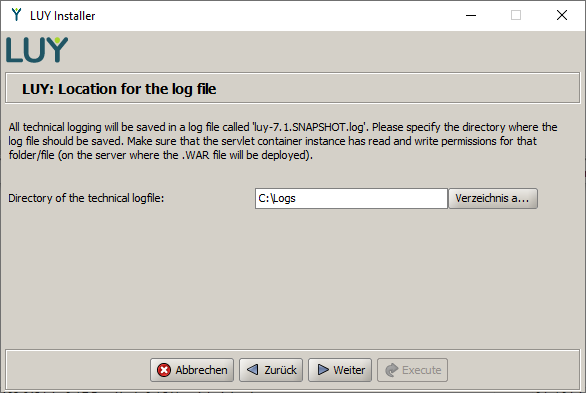 Next, you specify the folder in which the LUY technical log file should be stored. If you leave this field blank, the files are stored in the temp folder of the Tomcat installation. Make sure the servlet engine has read & write access to these paths. If you are also installing iTURM, you will be prompted for its log file path as well.