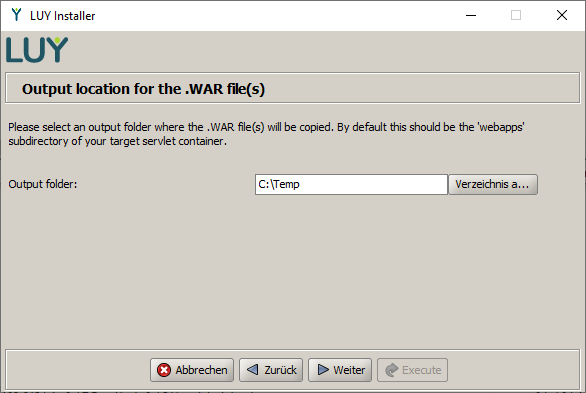 The next step is to specify a destination folder where the LUY installer will copy the generated luy.war file. We recommend choosing the webapps folder of Tomcat.