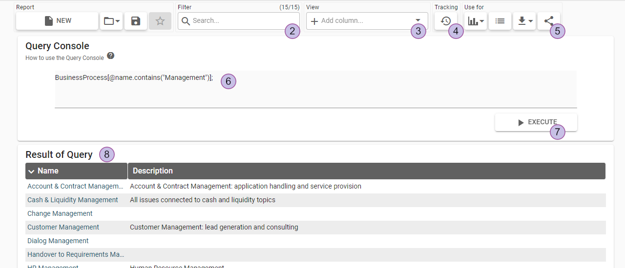 The result of the query is shown as a table at the bottom of the page. Depending on the result type, additional actions are possible similar to the building block list.