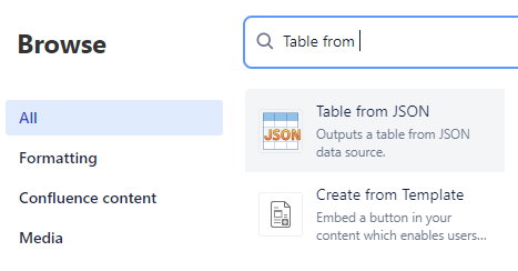 Select the macro „Table from JSON“ in Confluence.