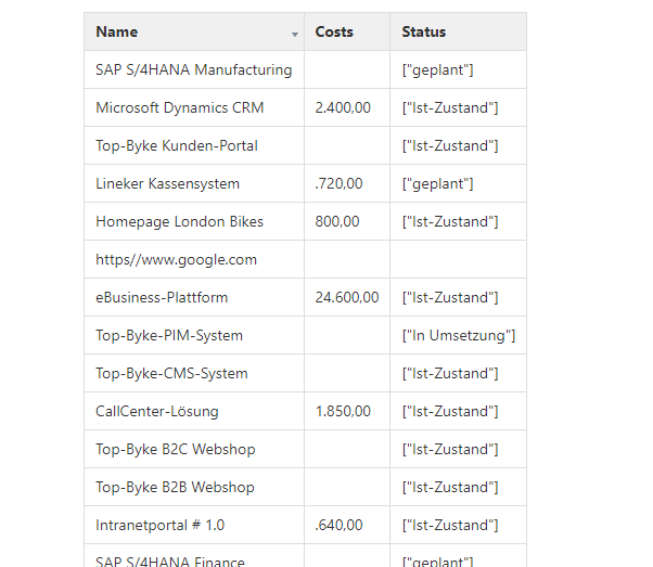 In the following example, we want to get a list of information systems and their attributes for “Costs“ and “Status”.
