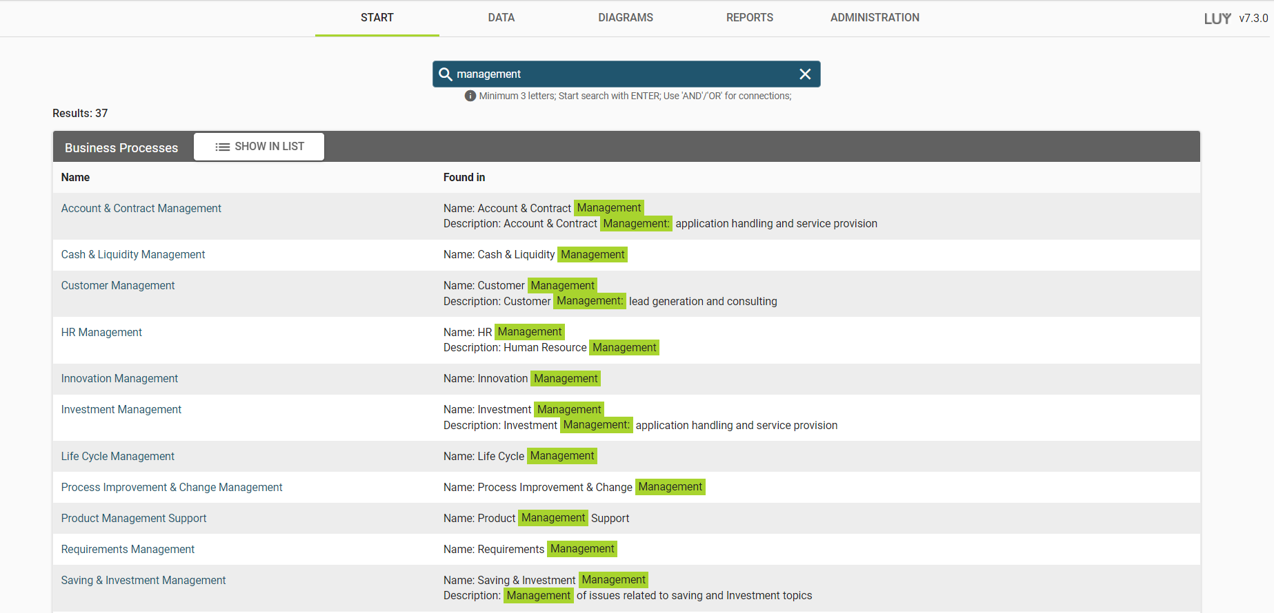 The full-text search on the "start" tab retrieves data from building blocks and relations. Names, descriptions, comments, and all attribute values are searchable. The results are ranked in order of relevance, calculated by the underlying search engine.