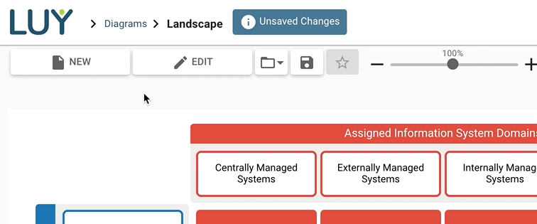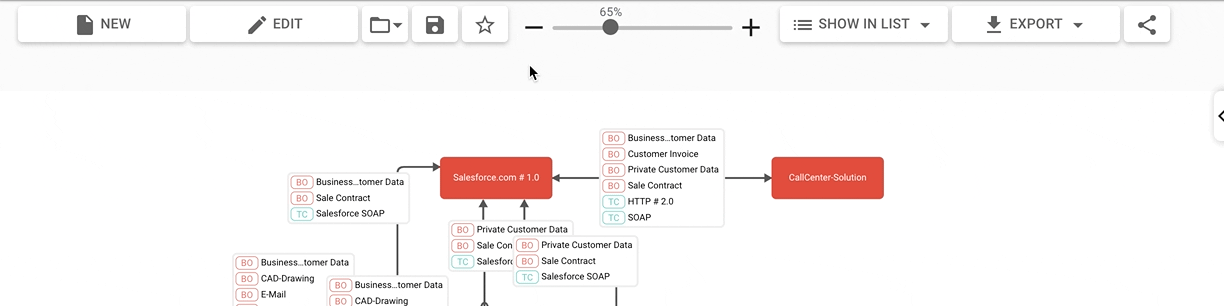 When opening a saved report, the diagram is initially set to view-only. This is helpful for presentation purposes, because it keeps the user interface simple by hiding the toolbar and other configuration instruments. It also prevents unintended modifications that could occur while exploring the diagram. Press “edit” on top of the diagram page to toggle edit-mode and access all configuration options.