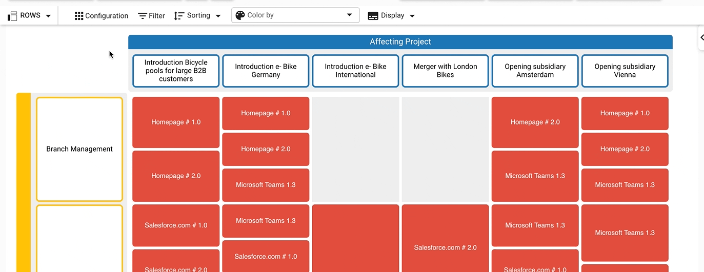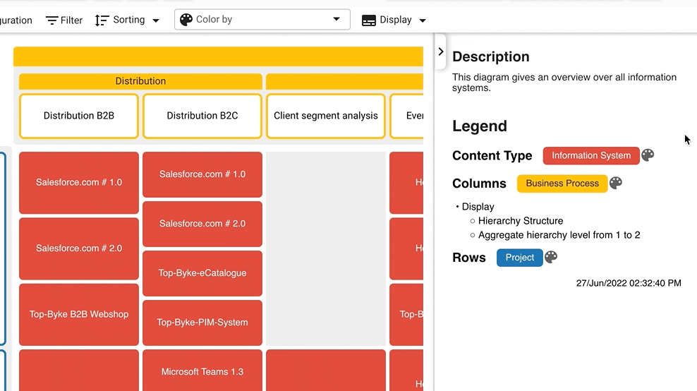 There is a long list of information systems visualized in the diagram, but not all of them are equally important to the viewer. You can choose to sort them by descending business criticality, to view the most important elements on top.