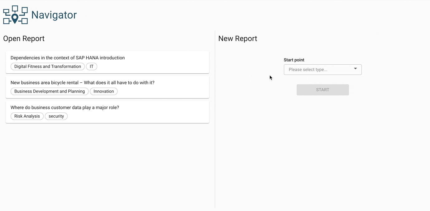 Explore the relations between elements by using the navigator. This visualization displays a building block at its center and shows all related elements grouped by relation type. It is possible to re-center to a different element, enable a deep-dive and expand the visualization further and even create new elements and relations, all from within the navigator.