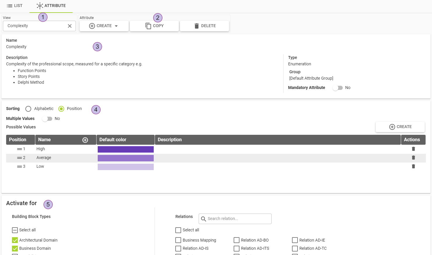 5. “Activate for”-section shows all building block types and relations which can be activated for this attribute
