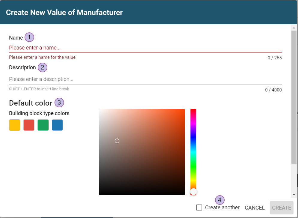 3. Create new values by clicking on the plus icon (3) in the name column or click the “create” button (4). More values can be added later, after creating an attribute. New values will be automatically sorted at the end of the list.