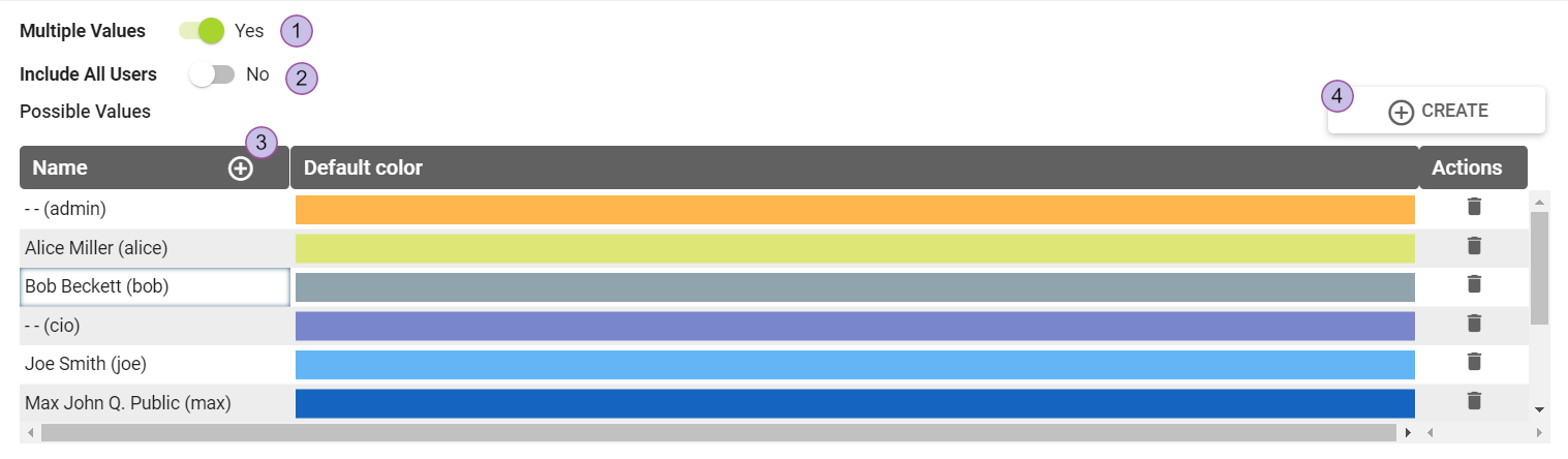 3. Add users by clicking on the plus icon (3) in the name column or click the “create” button (4). More users can be added after creating the attribute.