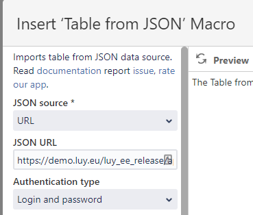 Select the macro „Table from JSON“ in Confluence.