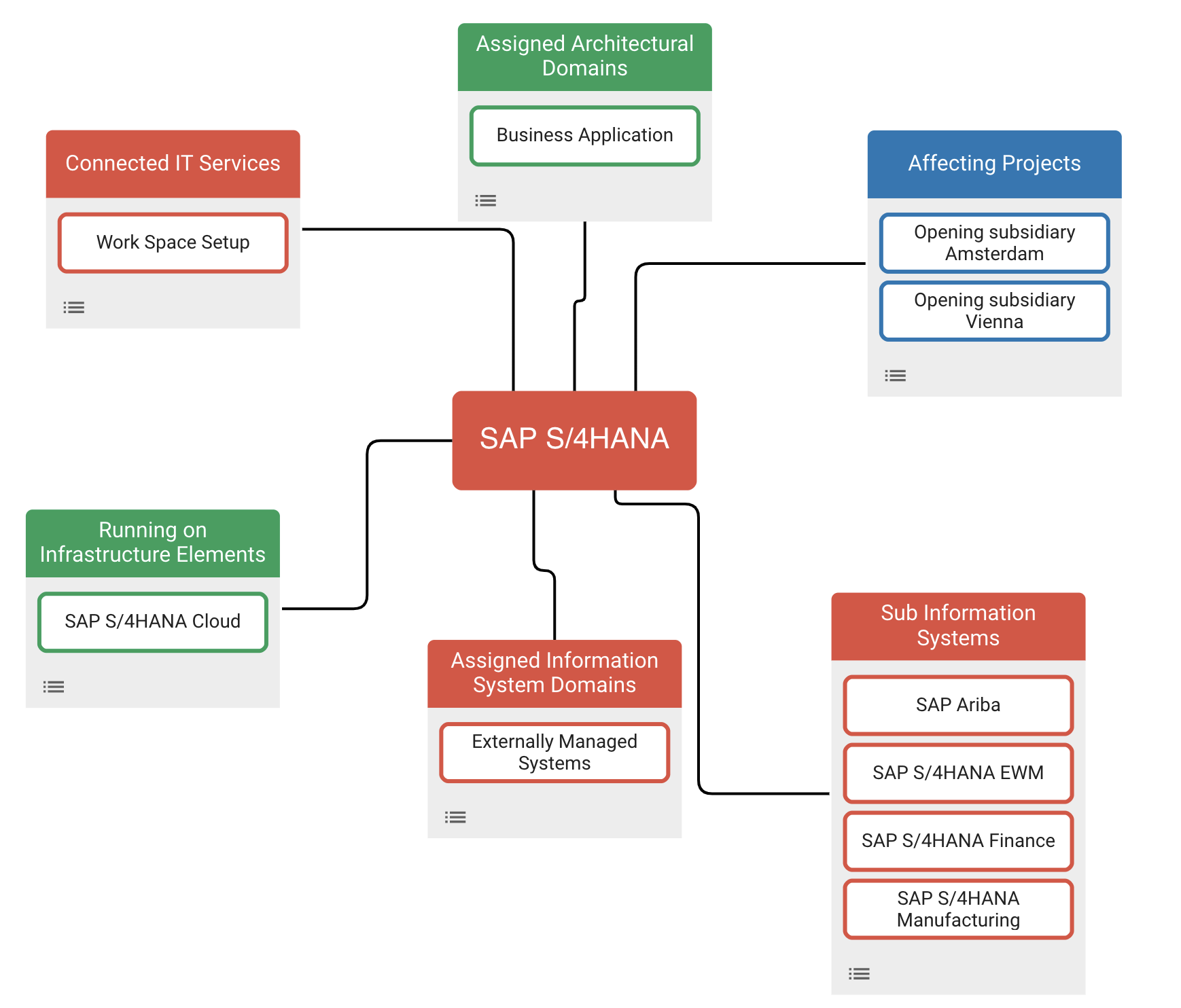 Explore the relations between elements by using the navigator. This visualization displays a building block at its center and shows all related elements grouped by relation type. It is possible to re-center to a different element, enable a deep-dive and expand the visualization further and even create new elements and relations, all from within the navigator.