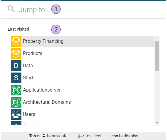 The quick access feature combines the history of recently accessed elements and a building block search. Open the quick access dialog by using the keyboard shortcut CTRL+K or by clicking on the magnifying glass icon in the LUY header.