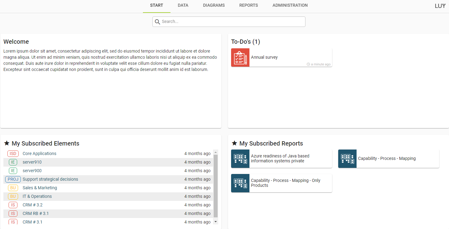 The LUY start page serves as a central overview of your most important data. It allows for a quick access of elements, surveys, and reports that you have subscribed to, or report groups according to tagged labels.
