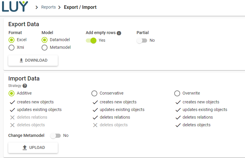 Meta model export containing the structure of the data modeled in LUY, without any data.