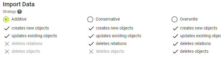 The additive import strategy is designed to add data to LUY. Data can either be updated or inserted but not deleted.