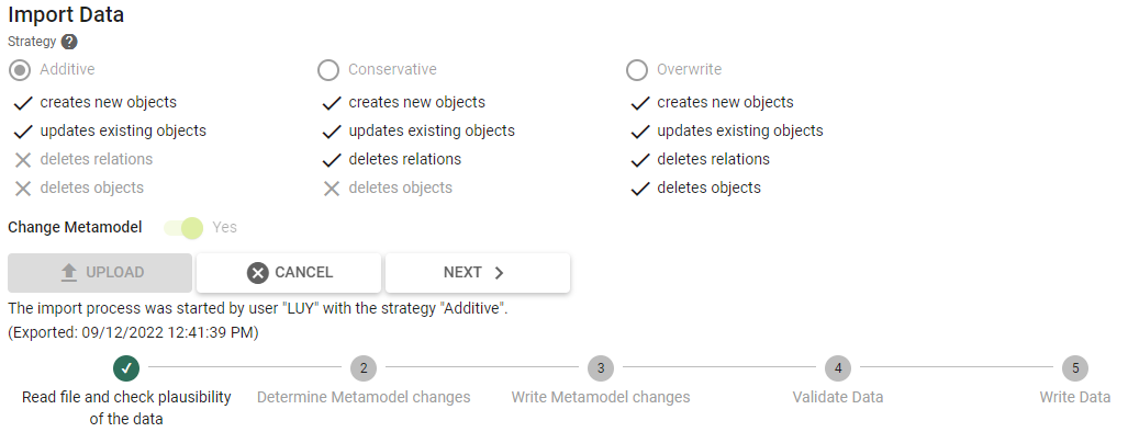 Canceling the import at this point does not roll-back the meta model changes applied in the previous step.Write data: LUY applies the data changes identified in the preceding step to the database.