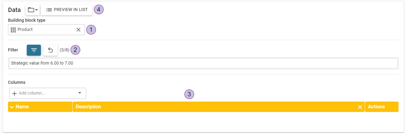 When clicking on the "preview in list" button, a new tab will open containing the selected columns and filtered elements configured for the survey.Survey data components with the option to select a building block type, apply a filter and configure columns.