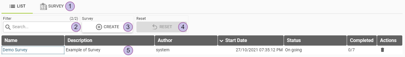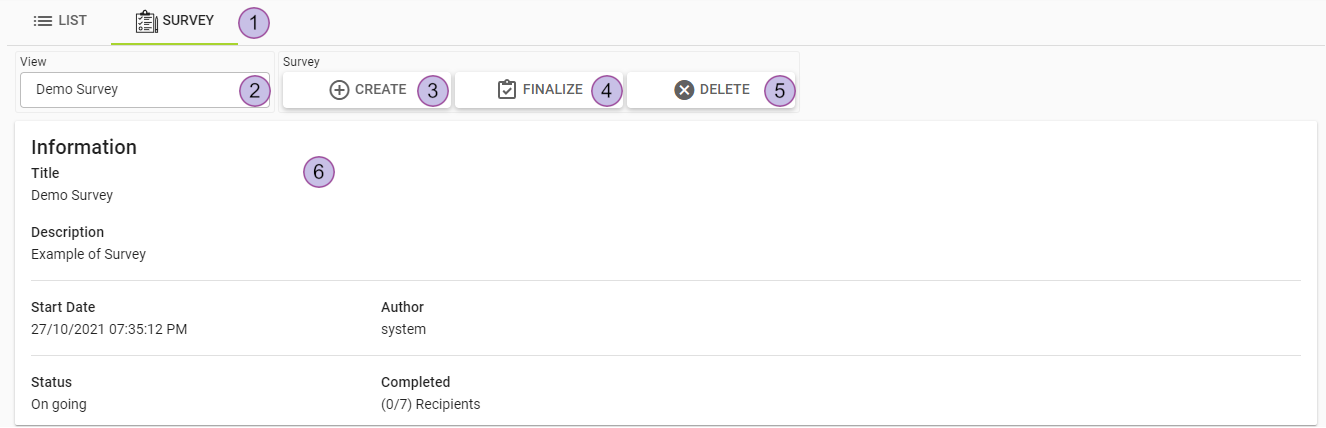 When clicking on a survey’s name in the list or switching to the tab button "survey" (1), the user will be redirected to the single survey view. The single survey view is divided into three components: