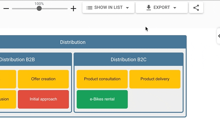 The external sharing functionality allows the user to share an up-to-date version of the diagram for access outside of LUY. This means the external sharing link can be viewed by anyone, and a LUY login is not necessary. Different links can be shared in different languages and file formats. When an external sharing link is accessed, a corresponding up-to-date export is generated. For performance reasons, a caching mechanism might cause a few minutes of delay when making changes to the data.