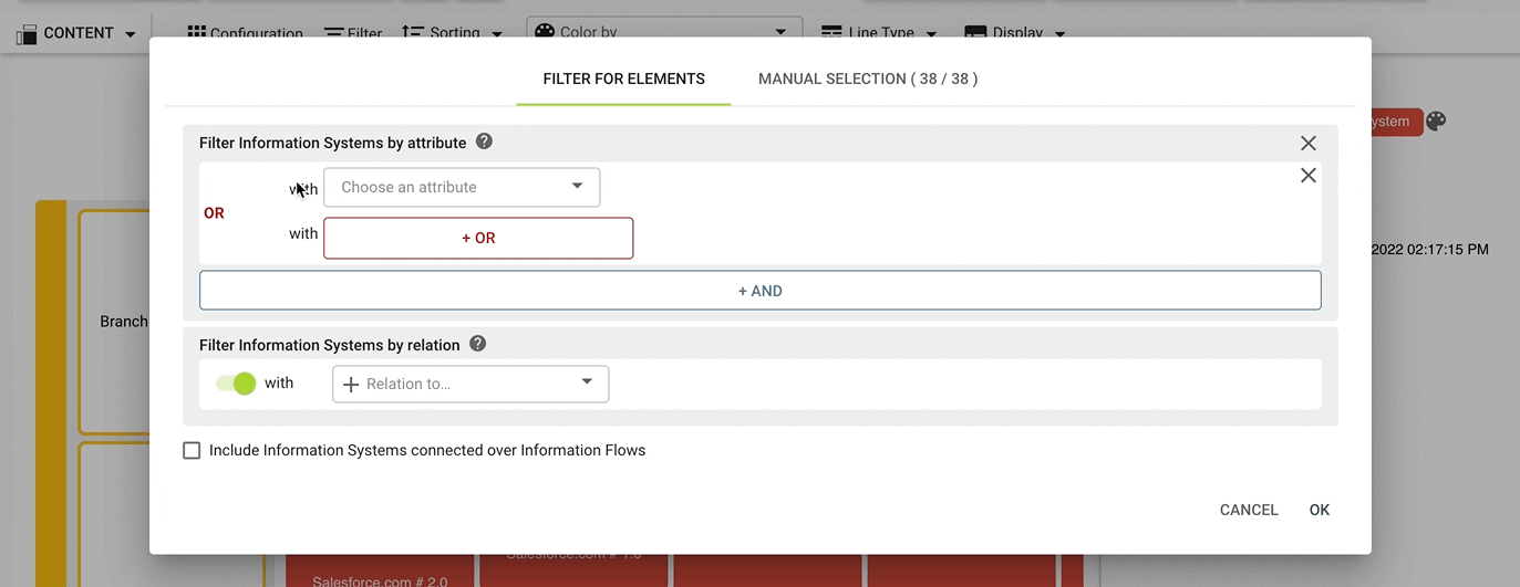 The set of displayed elements can be reduced by using the filter functionality. By default, diagrams use all elements of a selected type. Any attribute or relation can be filtered, combining multiple conditions via logical connectors, in addition a manual selection of elements can be set. Learn more about filters here.