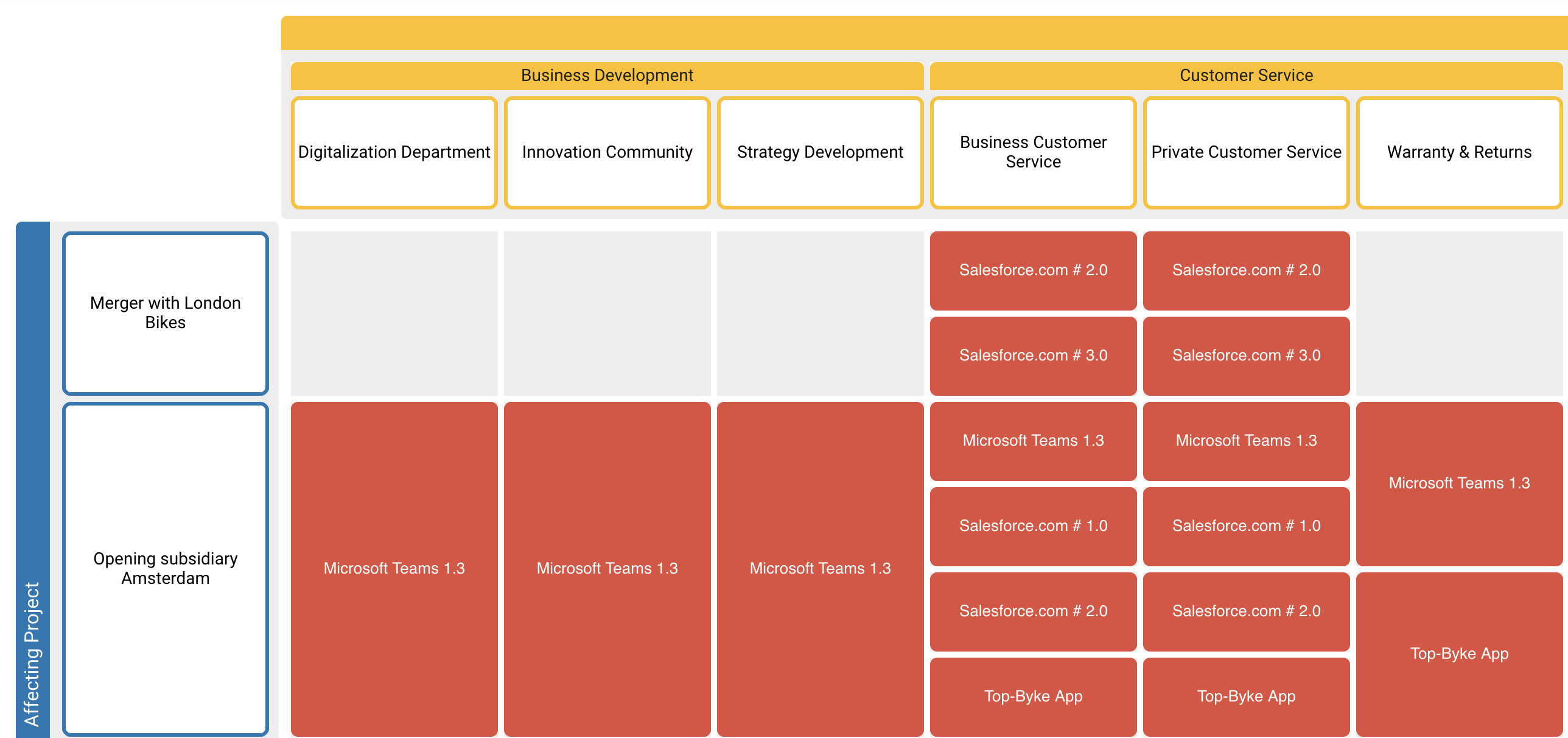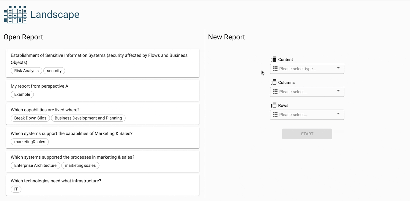 Visualize building blocks in a matrix-like structure based on their relations and attributes using the landscape diagram. This visualization allows specifying a building block type to show as content in the center, and then choose relations or attributes for the columns and rows. This way even complex relationships can be displayed in an easy to comprehend visualization.