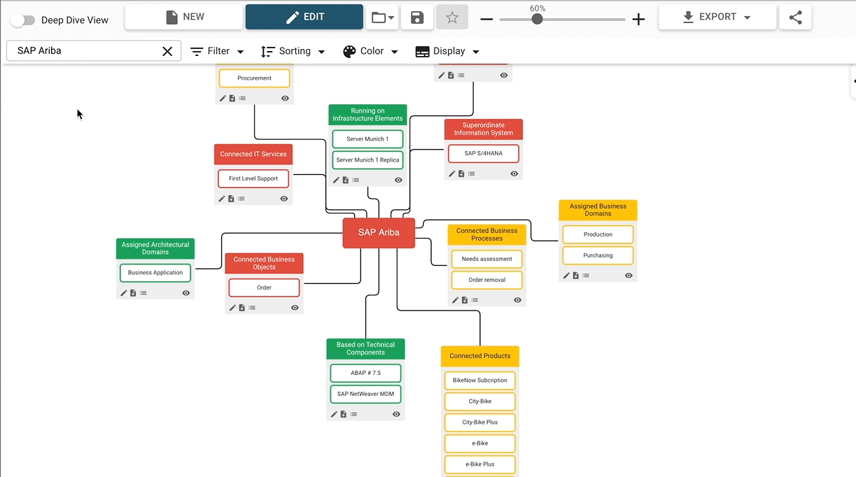 Explore the relations between elements by using the navigator. This visualization displays a building block at its center and shows all related elements grouped by relation type. It is possible to re-center to a different element, enable a deep-dive and expand the visualization further and even create new elements and relations, all from within the navigator.