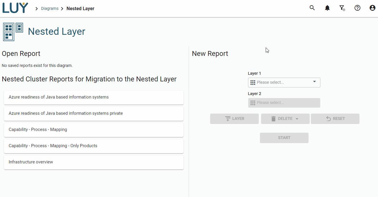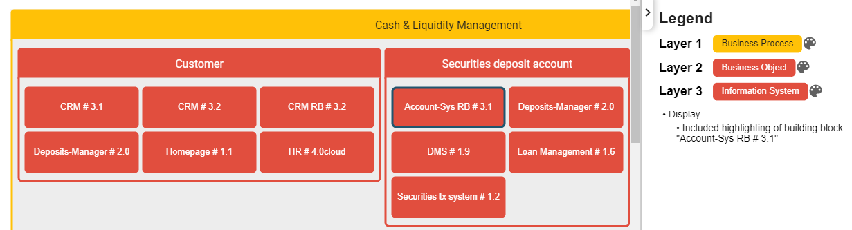 The nested layer diagram provides a way to visualize interdependencies starting at business architecture down to infrastructure in one single diagram. Up to seven layers can be displayed in this diagram.