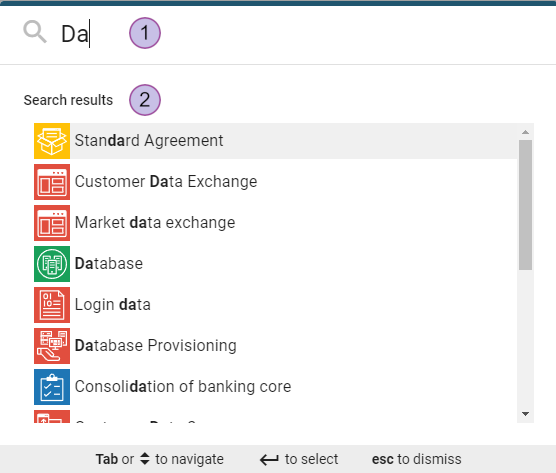 List of all matching building block elements. The results are ranked in order of relevance, calculated by the underlying search engine. The number of results displayed is limited to fifty entries.