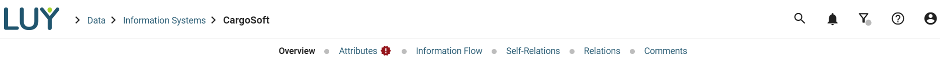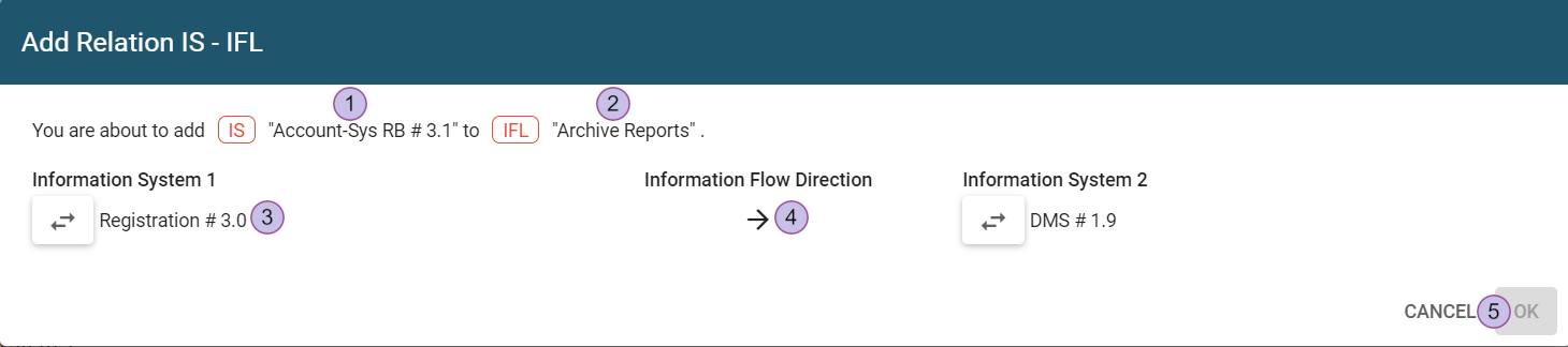 When adding a relation, only the last modification time of the information system is changed, for example, if a connection to a project in the single element view of an information system is added. Only one self-relation can be added at a time.