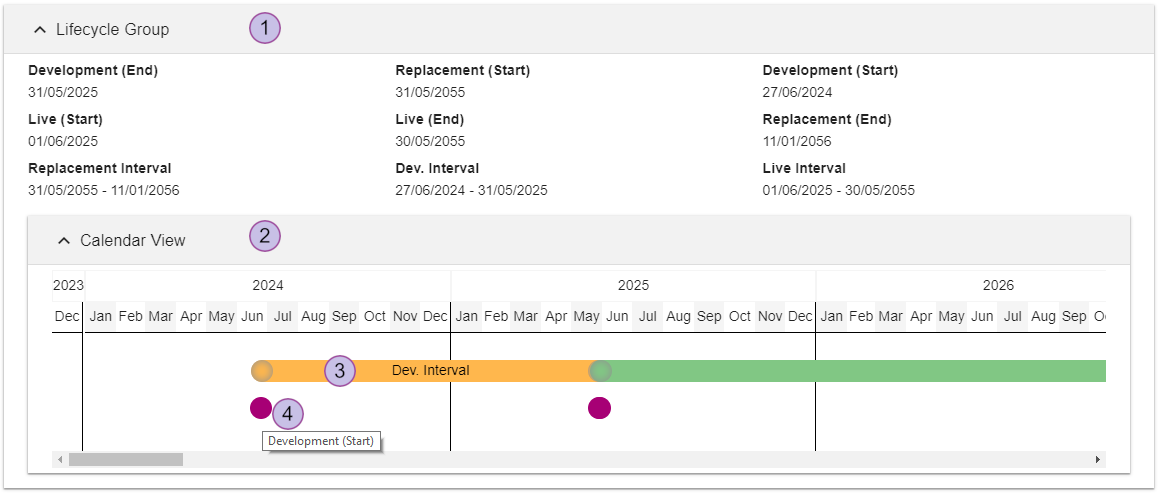 Calendar view (expanded) with all date intervals and date attributes. The range of the calendar is limited to 30 years in the past and 30 years in the future based on the current date. Everything outside of this range is cut off. If all date and duration values are set outside of this range, the calendar view is not displayed at all.