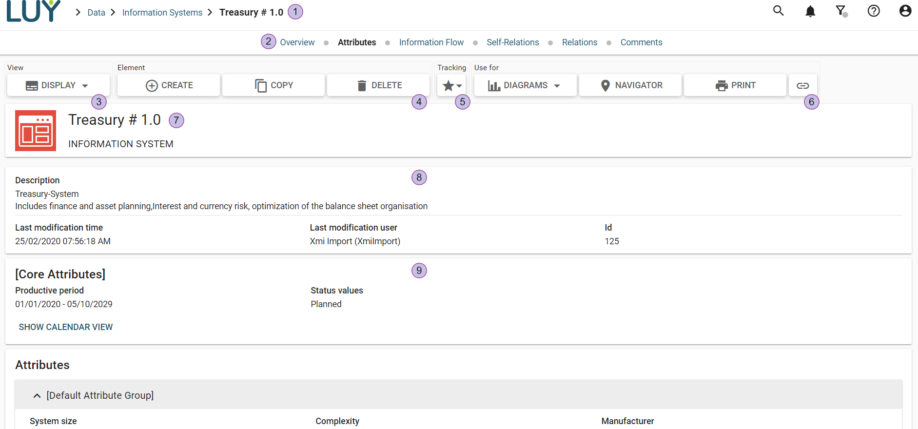 The single element view shows all information about an element. It is available for all building block types, except business mappings. The single element view can be accessed from the list view and from any diagram by clicking on the name or id of an element.