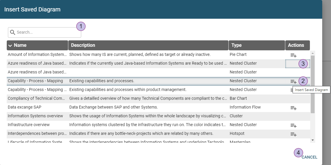 The diagram will be added as a custom tag to text area: <Diagram>UUID</Diagram>If the user doesn’t have permission for the report, there is no action button