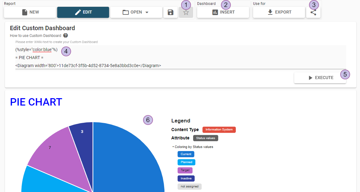 The custom dashboard is a page which is easy to read and contains diagrams with the latest data. While creating a dashboard instance, choose which saved report is displayed on the dashboard. The custom dashboard supports markdown text formatting.
