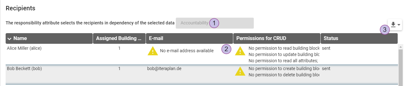 Any yellow warning icons in the email column hint to a missing email address. If a recipient does not have the necessary permissions, a yellow warning icon is shown, too. Check that all relevant users have appropriate permissions for the building block in the survey.